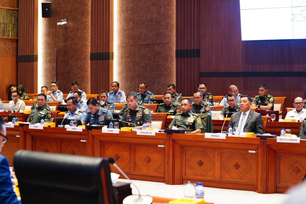 (Puspen TNI). Panglima TNI Jenderal TNI Agus Subiyanto bersama Menteri Pertahanan (Menhan) RI Sjafrie Sjamsoeddin didampingi Kepala Staf Angkatan menghadiri rapat kerja bersama Komisi I DPR RI dengan agenda pembahasan peningkatan kesejahteraan prajurit, penanganan dan pengelolaan aset TNI, serta Implementasi Memorandum of Understanding (MoU), bertempat di Ruang Rapat Komisi I, Gedung Nusantara II, Jakarta Pusat, Rabu (30/4/2025).