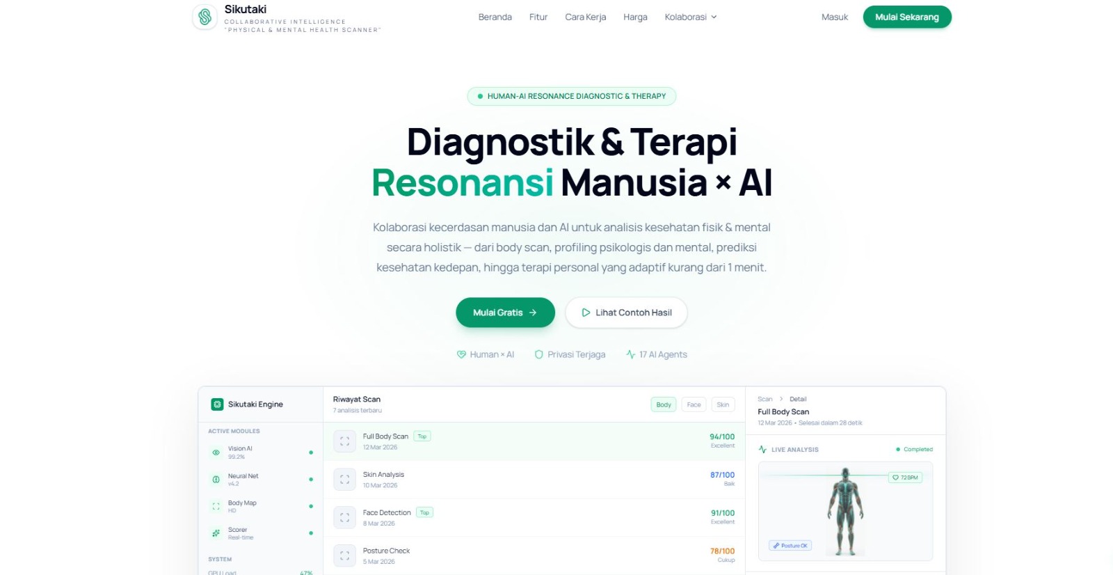 “ Saya kaget ternyata saat ini di Indonesia telat tersedia website www.Sikutaki.com sebuah platform digital kolaborasi kecerdasan manusia dan AI untuk analisis kesehatan fisik & mental secara holistic, mulai dari body scan, profiling psikologis dan mental, prediksi kesehatan kedepan, hingga terapi personal yang adaptif kurang dari 1 menit. Sungguh sebuah capaian anak bangsa yang sangat membanggakan “, ujar Pemerhati Kesehatan Digital Dede Farhan Aulawi di Jakarta, Minggu (29/3).
